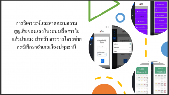 การวิจัยครั้งนี้ เป็นการวิเคราะห์และคาดคะเนความสูญเสียของแสงในระบบสื่อสารใยแก้วนำแสงสำหรับการวางโครงข่ายกรณีศึกษาอำเภอเมืองปทุมธานี โดยมาจากปัญหาอินเทอร์เน็ตที่ล่าช้า เป็นสิ่งที่ทุกคนต้องเคยเจอกัน ซึ่งปัญหาอาจเกิดมาจากหลายๆปัจจัย เช่น การสูญเสียของสัญญาณแสงในสายใยแก้วนำแสง ซึ่งเป็นส่วนสำคัญที่ทำให้เกิดความผิดพลาดของข้อมูลข่าวสาร ซึ่งอาจมีสาเหตตุที่มาจาก Loss Budget ซึ่งเป็นค่าความสูญเสียของแสงในระบบสัญญาณที่ระบุในหน่วยเดซิเบล (dBm) มีการเกิดขึ้นตลอดสายเคเบิลในการให้บริการโครงข่ายใยแก้วนำแสง ล้วนมีข้อกำหนดด้านค่าความสูญเสียของแสงในระบบจากการปล่อยสัญญาณที่แตกต่างกันไป เพื่อให้มั่นใจว่าไม่ได้เกิดการสูญเสียของแสงในระบบมากเกินจนเกิดขีดจำกัด จนทำให้ไม่สามารถส่งสัญญาณไปถึงปลายสายอีกด้านหนึ่งได้ เราควรหาค่าขีดจำกัดการสูญเสียของแสงในระบบหรือ Loss Budget เพื่อเป็นจุดประสงค์ในการใช้งานและเพิ่มความสะดวกในการใช้งาน