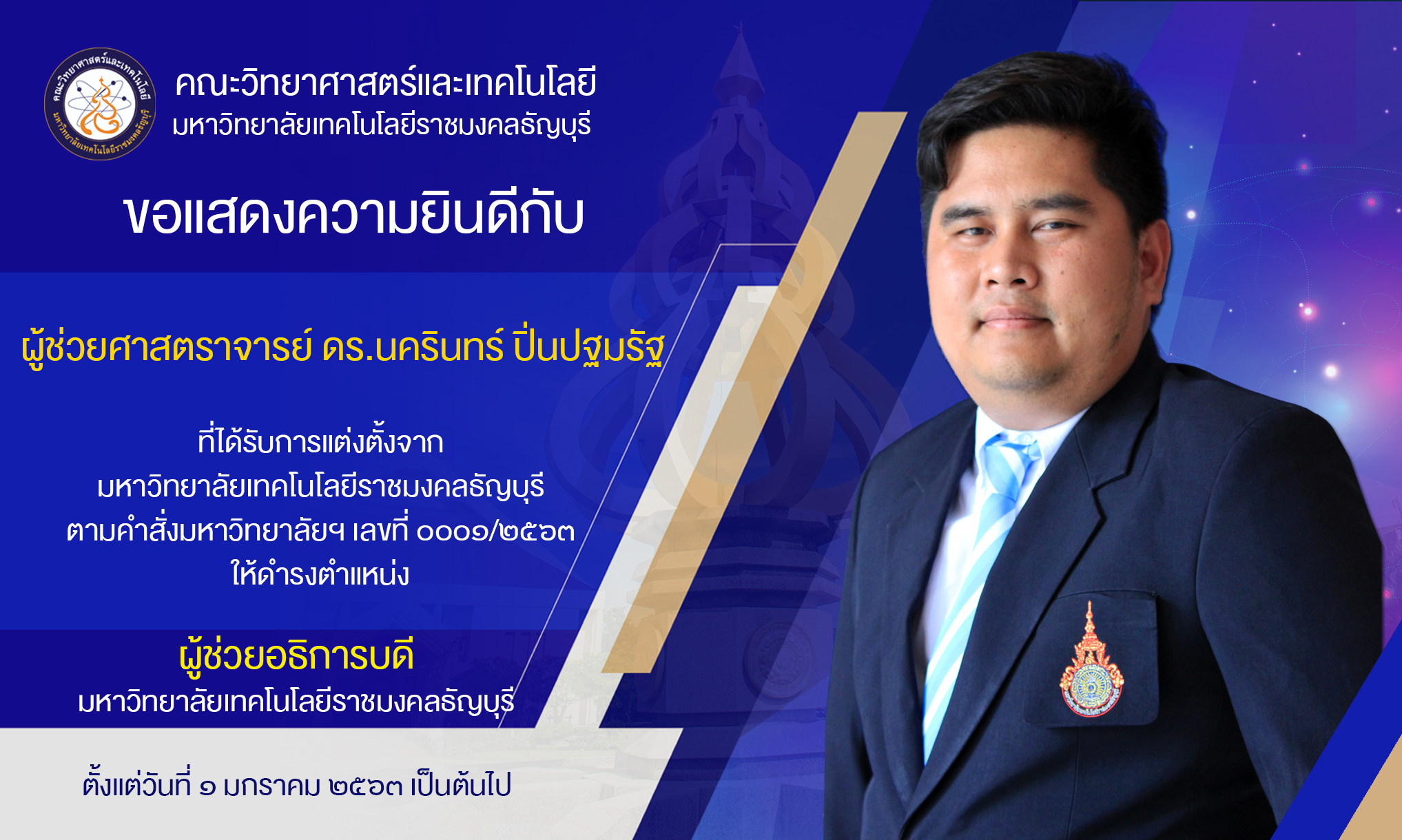 Posted on January 1, 2020March 22, 2024 by Taweelap Suwattanapunkulคณะวิทยาศาสตร์และเทคโนโลยี ขอแสดงความยินดีกับคณาจารย์ที่ได้รับการแต่งตั้งให้ดำรงตำแหน่ง ผู้ช่วยอธิการบดี มหาวิทยาลัยเทคโนโลยีราชมงคลธัญบุรี