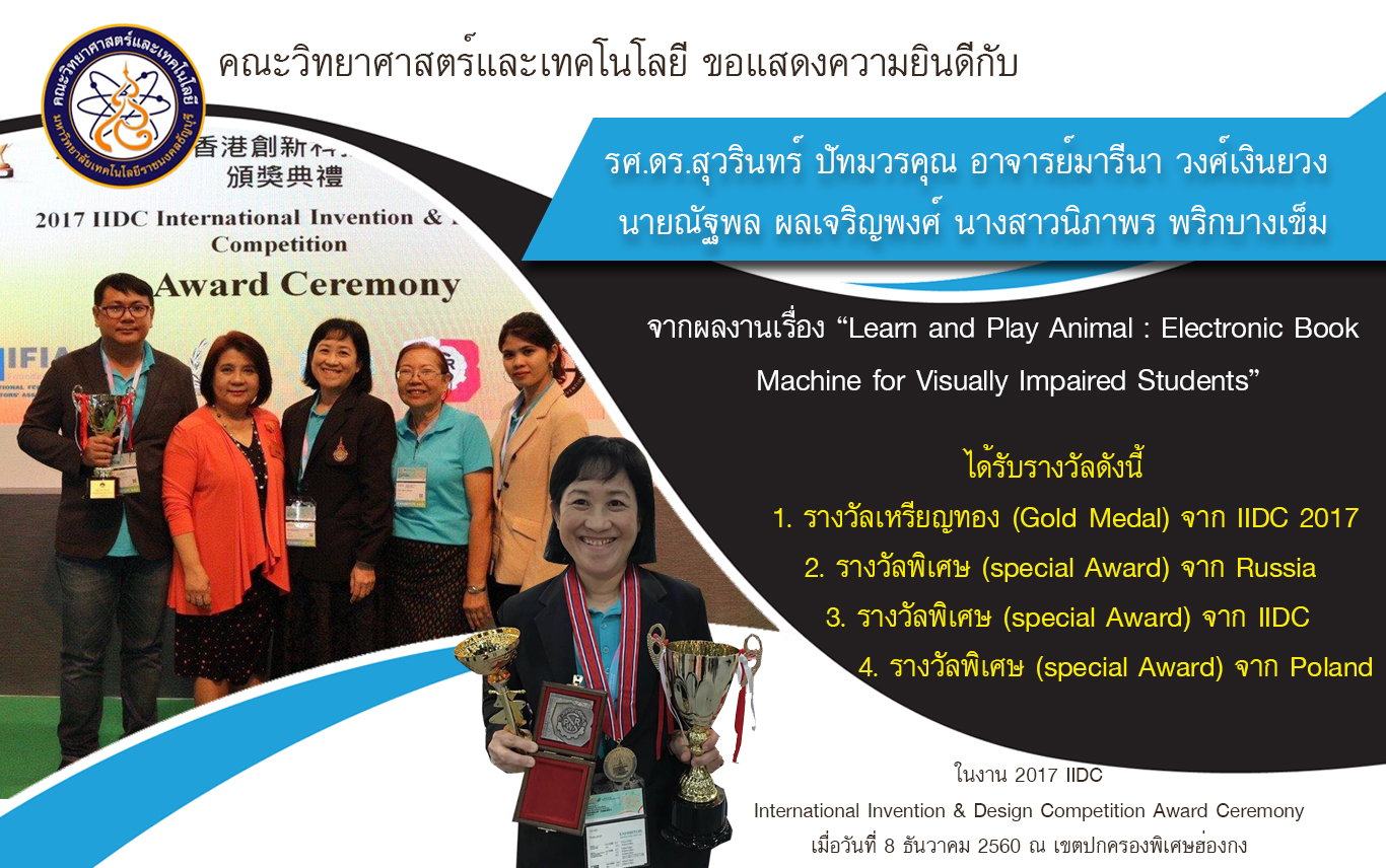 Posted on December 18, 2017March 22, 2024 by Taweelap Suwattanapunkulขอแสดงความยินดีกับทีมนักวิจัยคณะวิทยาศาสตร์และเทคโนโลยีที่ได้รับรางวัลจากงาน 2017 IIDC